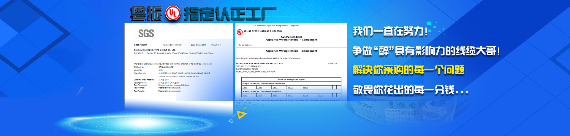 當今世界科技發展突飛猛進,足以使人類可以上天攬月,下海捉鱉,創新創造,日新月異!經過多年來的發展沉淀粵振線纜的生產制造水平也同樣日薪月異,從早期的電子線生產加工,到現在的高溫環保硅膠電線的開發生產,我們不斷走在時代前緣.粵振電線電纜有限公司雖然組建時間不長,但由于我們積極在電線電纜行業中才不斷引進人才,不斷引入先進設備,使我們打造了一支專業化技術團隊,銷售團隊。多年來的電線生產歷程我們收獲頗多!同時也讓我了解到要在競爭中站穩腳步!踏踏實實,目光不能只限于自身周圍的小圈子,要著眼于大局,著眼于今后!如今我們與國內外多家品牌電子電線廠商合作,逐漸成為電子線纜業起著重要力量。粵振產銷高溫線、硅膠線,硅膠電線、鐵氟龍高溫線、主打產品為硅膠線、硅膠高壓線、硅膠編織線、鐵氟龍高溫線、PVC電子線、屏蔽線以及特種線纜等.......目前,公司主要生產各類,硅膠電線、特軟型硅膠電線,UL3135 3239 3122 1332等耐高壓高溫電線、高清數字電視連接線,電腦網絡線,汽車燈高壓脈沖線,RG光軸線,及線束加工制品,為燈飾制品企業、家用電器制造業、電腦制造業、汽車動力電池、電動自行車、電動摩托車、旅游觀光車、高爾夫球車,汽車生產商、電視視頻制造商、航空航天、高檔商品房開發等行業提供優質的產品及服務,公司產品已獲得UL、SGS等國內國際認證。粵振線材生產加工部主力為:航模線束:各種模型的周邊線材:平衡充套線、電子調速線、電調舵線、電池馬達線等周邊連接線。廣泛應用于:航模、車模、船模、機器人等高級遙控模型領域。精細線材:0.8插頭、1.0插頭、1.25插頭等高精度連接線。廣泛應用于:筆記本電腦、數碼相機、高級游戲機、移動電源等連接線。